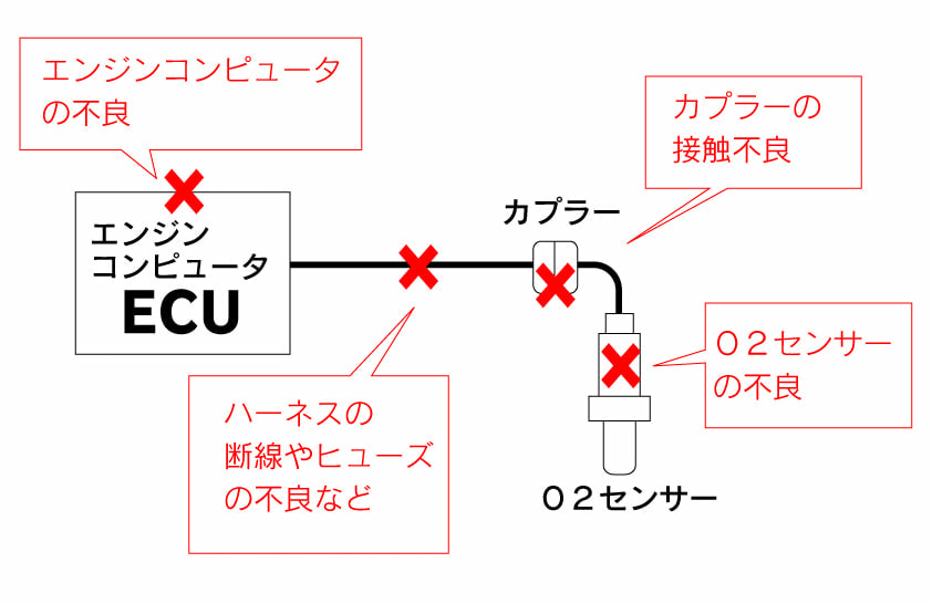 電圧値がアクセルの開閉に合わせて変化しなければ、O2センサーの不良が考えられます。